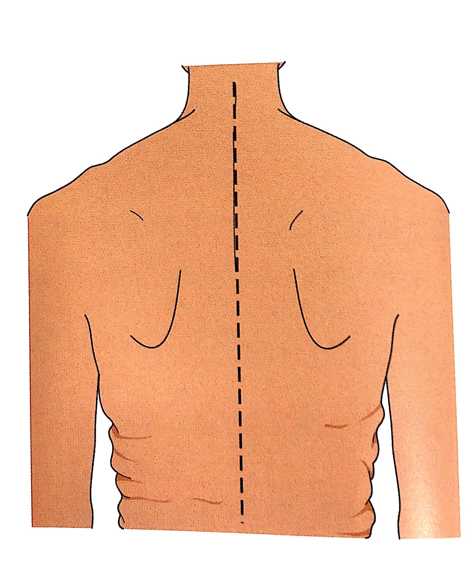 观察:观察胸椎是否笔直,是否有任何脊椎侧弯(如下图所示)的表现。如果有必要,可以触摸胸椎的棘突,像触诊颈椎一样标记处每一节椎骨的位置,但请记住我们当中的一些人会存在记住偏离垂直位的问题。