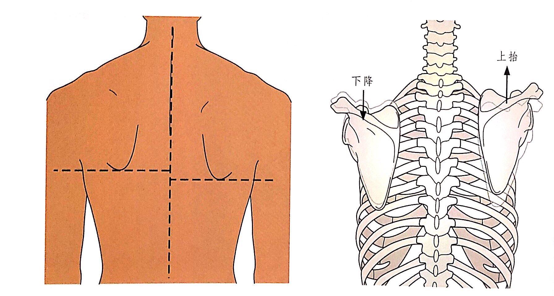 观察:还在关注于肩胛骨,确认并比较齐下脚的位置,他们是否等高?还是一高一低?如果有必要,你可以用彩绘笔在身上做标记,要记住肩胛骨可以像下图画出的一样,会有上抬和下降。