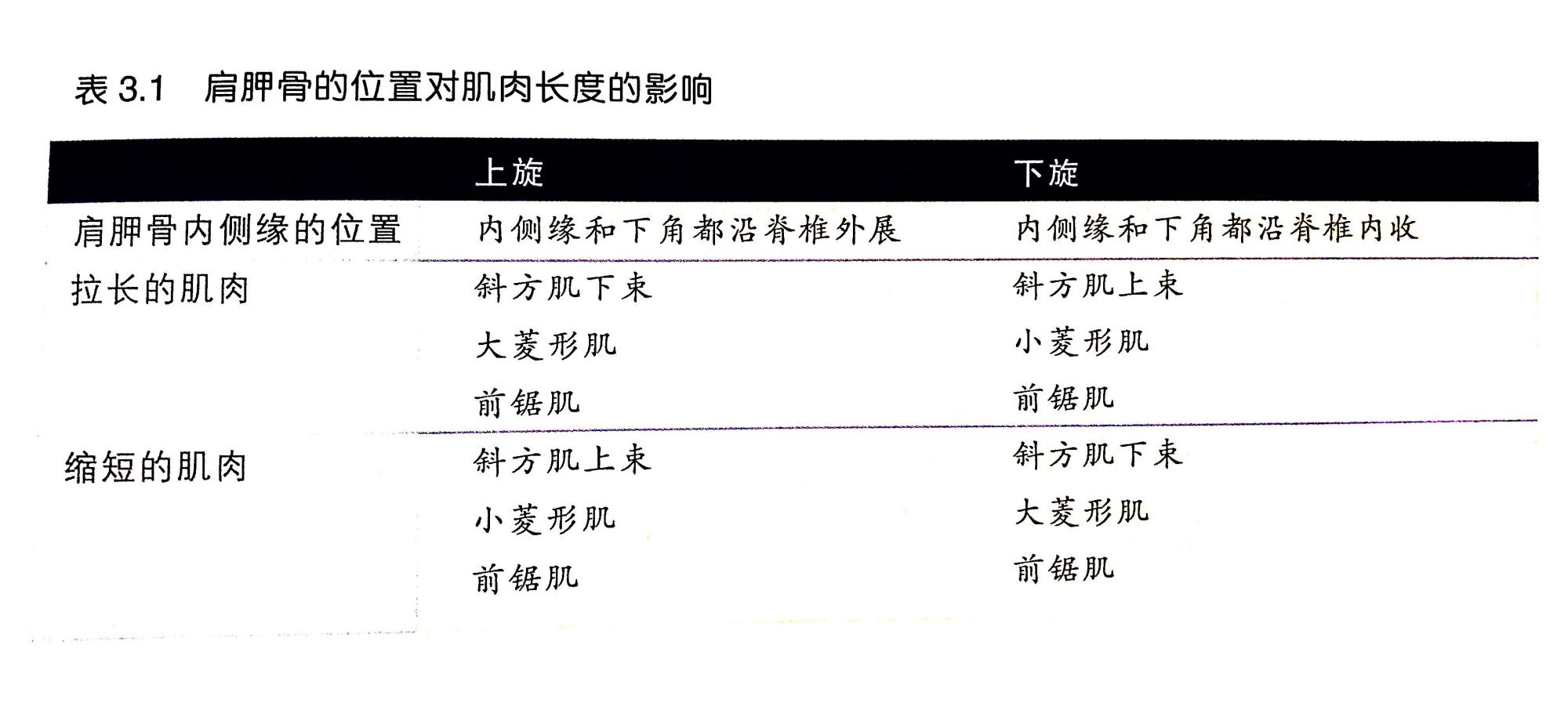 表3.1 肩胛骨的位置对肌肉长度的影响
