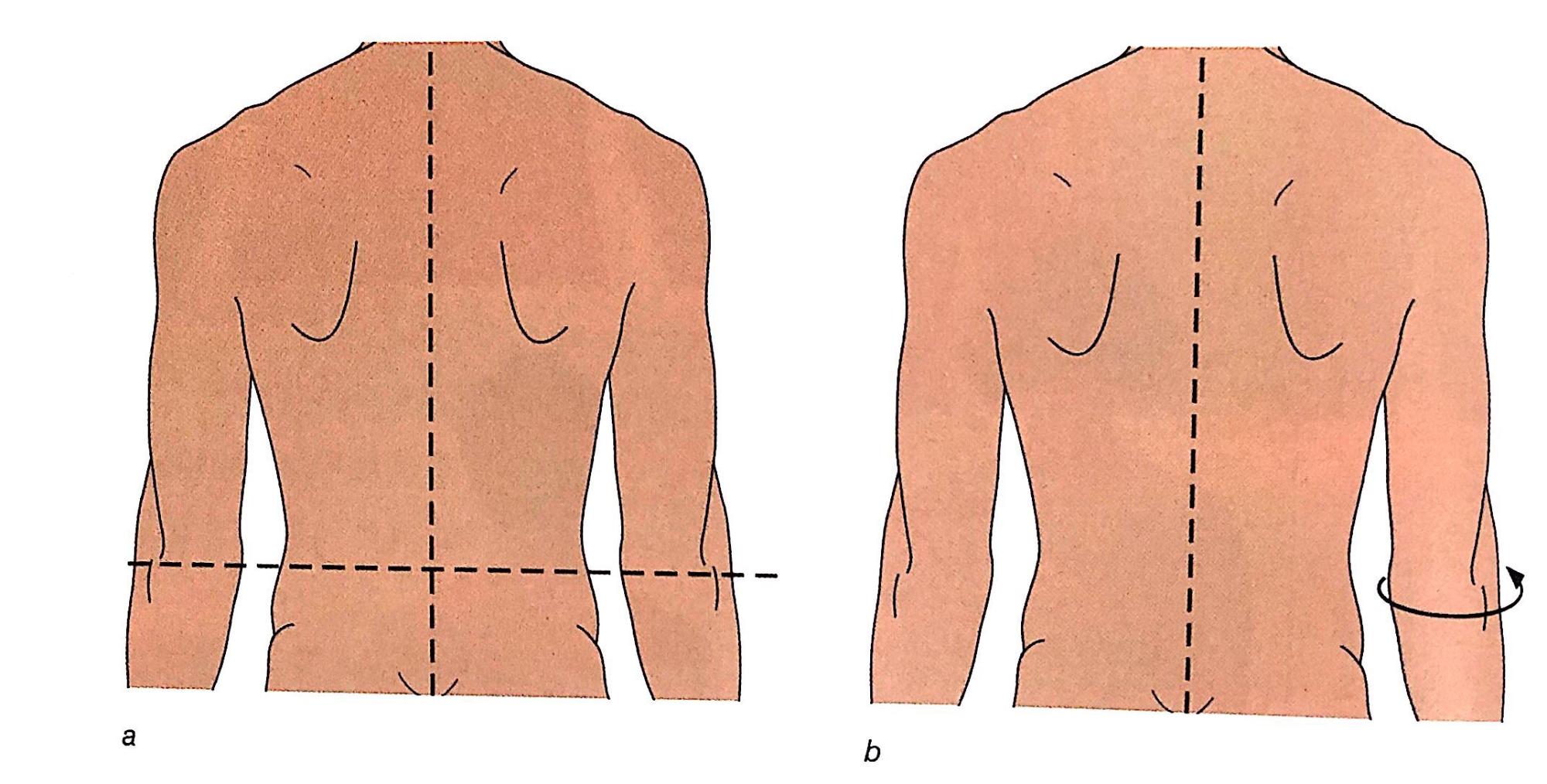 诊断:同样的,如果你无法直接观察到下角,并且想要触诊定位也很困难时,那么就让受试者将手背在身后,这样可以使骨头位置更明显。当你定位好位置后,这受试者把手放回原位以便你观察骨头位置。