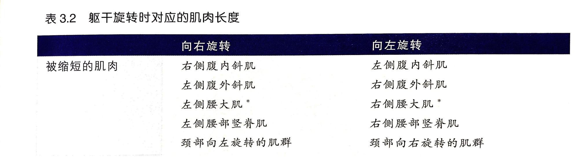 分析:不仅仅是与胸口相连的肌肉,许多其他肌肉也能影响胸廓的旋转。表3.2总结了当躯干的位置发生旋转时肌肉长度会发生怎样的变化。如果你对包含颈部的肌肉感到困感,那么请你对着镜子像一个方向转动身体,你会发现你的颈部肌肉必须被拉伸,以此确保头部面向正前方。
