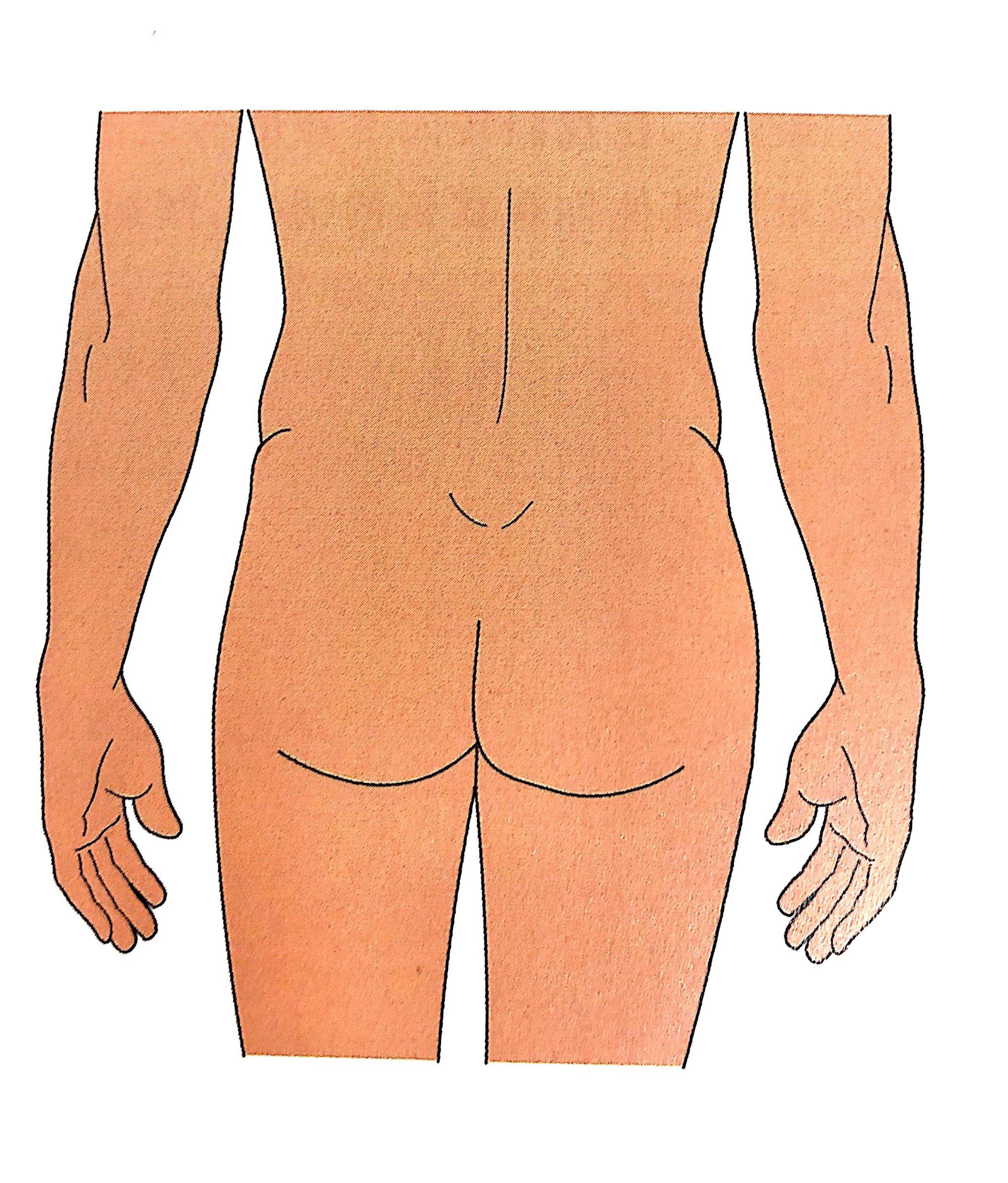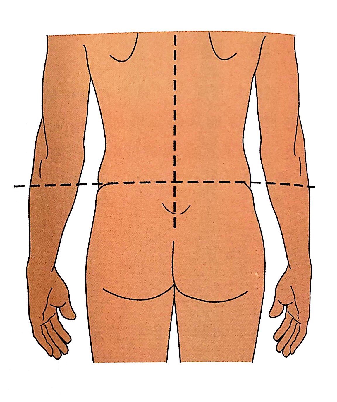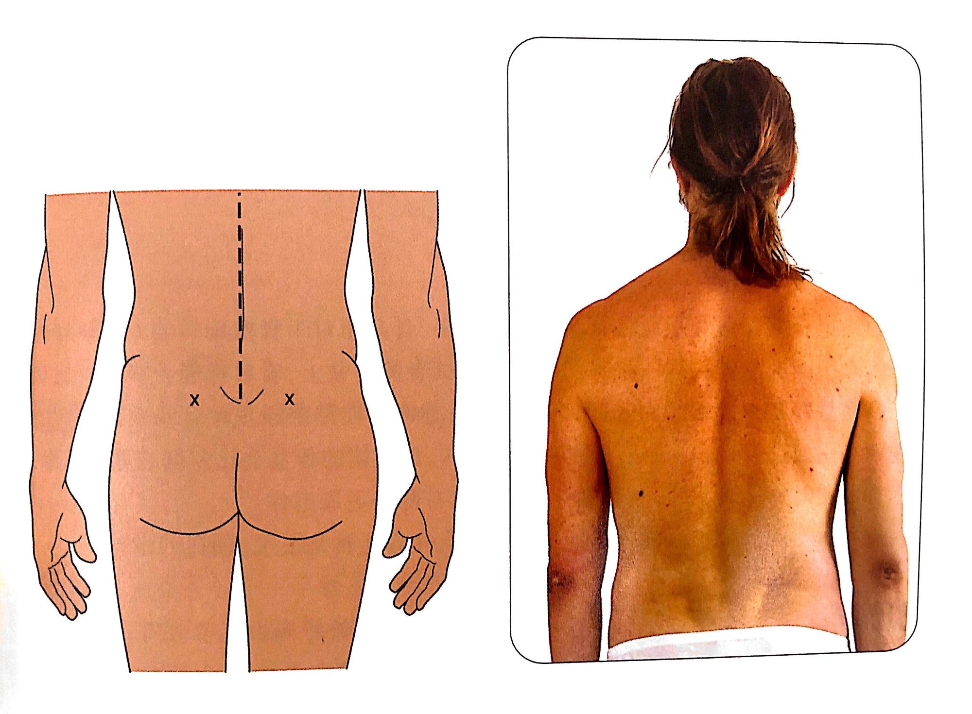 观察:对于有腰窝的人而言,髂后上棘直接位于腰窝之下。用大拇指感受髂后上棘是否等高也是一个在站在位确定骨盆是否倾斜的方法。照片中,受试者的腰窝显示其右侧髂后上棘比左侧的位置高,你认为其脊椎是笔直的还是稍稍向右上倾斜呢?