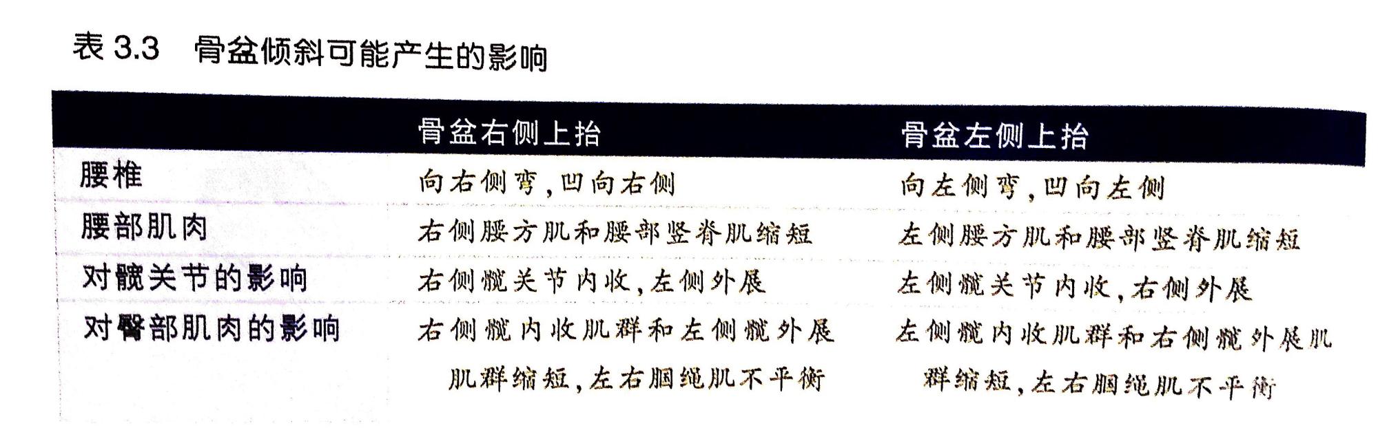 分析:表3.3总结了上述的观察问题。其实为了配合右侧抬升的骨盆,受试者会代偿性地增加腰椎右倾的幅度,这可能会导致右侧产生更多且更深的皮肤褶皱。因此右侧腰方肌和右侧部分腰竖脊肌可能会缩短。此外可能存在右髋内收、左髋外展的情况。因此受试者骨盆右侧抬升,可能伴随左侧髋外展肌群和右侧髋内收肌群缩短的情况。一个长短腿的人可能有骨盆倾斜的问题。