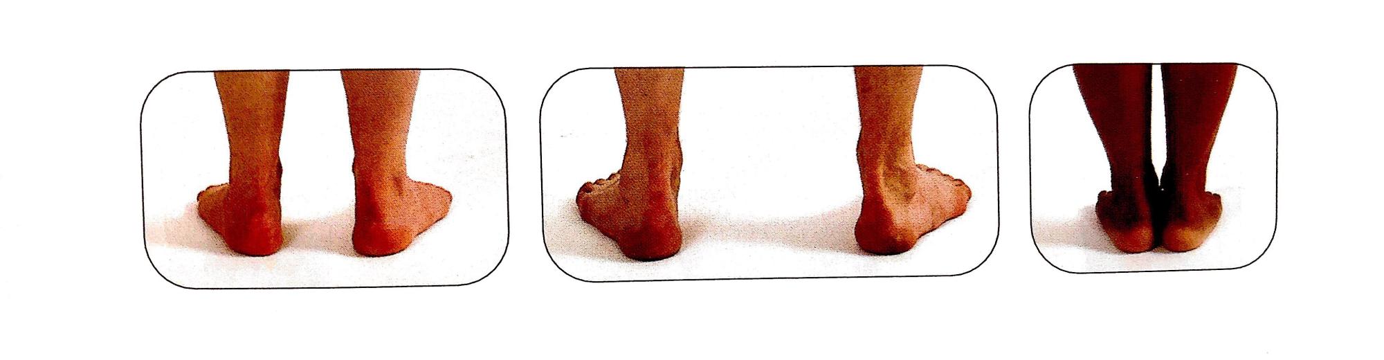 观察:请观察跟腱和跟骨的位置。如果有必要,可以画一条沿着跟腱向下,越过跟骨到地板的线。然后站在受试者身后观察你画的线,跟腱是笔直的、向外凸的还是向内凹的?教师呈外翻还是内翻状态?