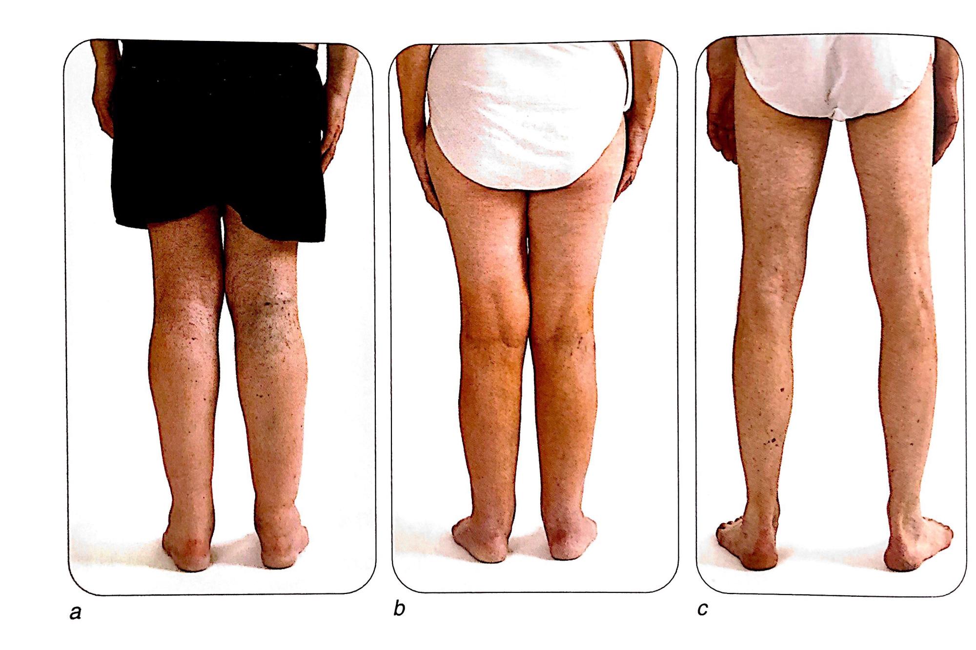 分析:一些情况下你能观察到膝内翻,而在另一些情况下你会发现膝外翻。你可以在“膝外翻和膝内翻”获取更加详细的信息。其中,图a中存在轻微右膝外翻的情况,图b中存在轻微左膝外翻的情况,图c中存在轻微右膝内翻的情况,观察右胫骨是否可能存在弯曲。