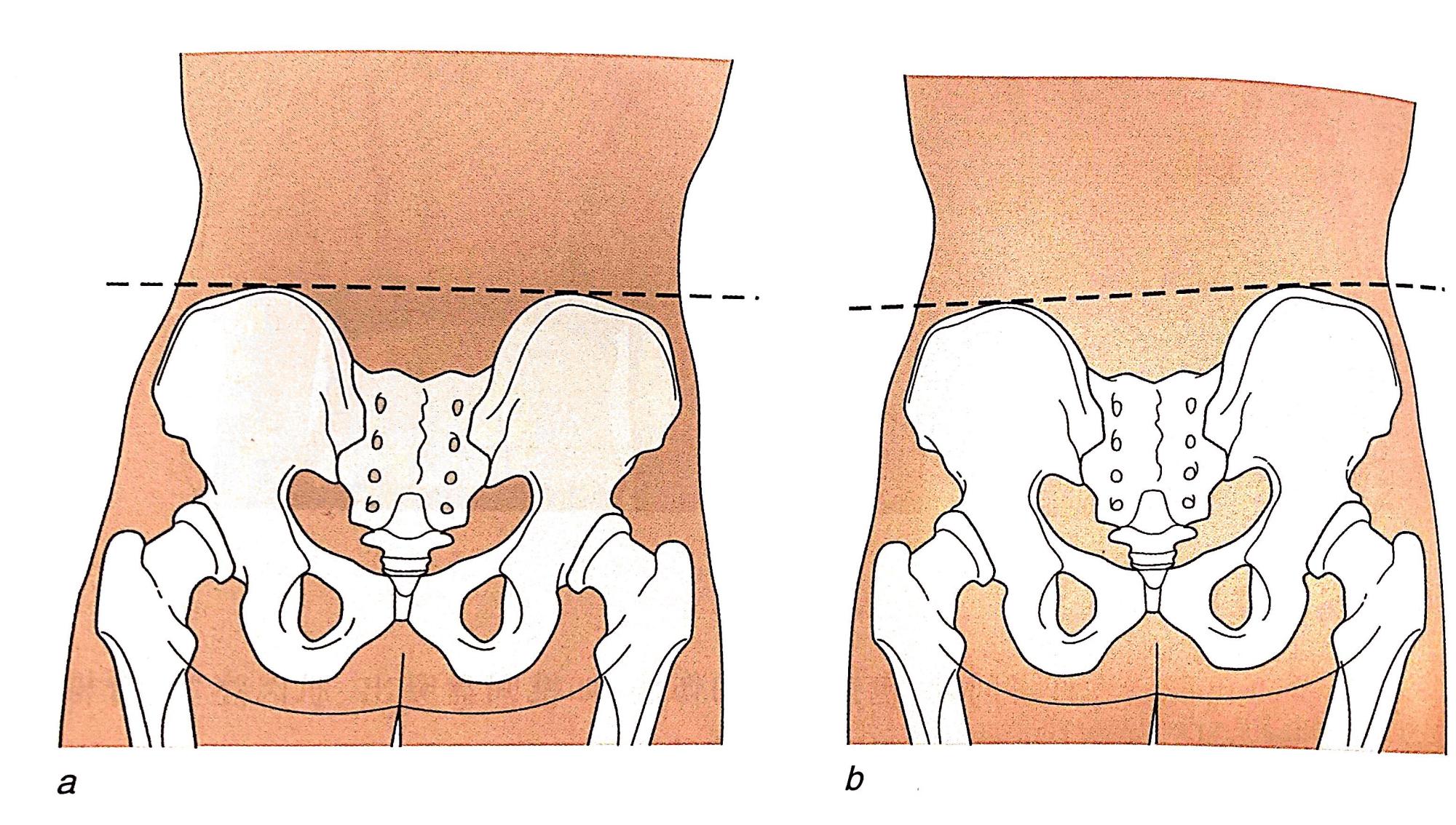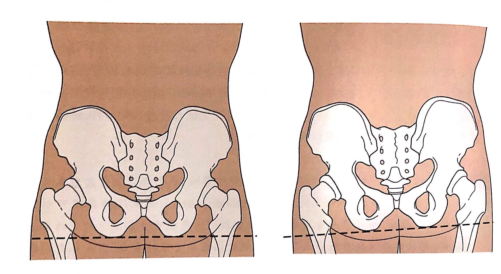 图a显示正常的骨盆,图b显示的骨盆右侧向上倾斜,左侧向下倾斜