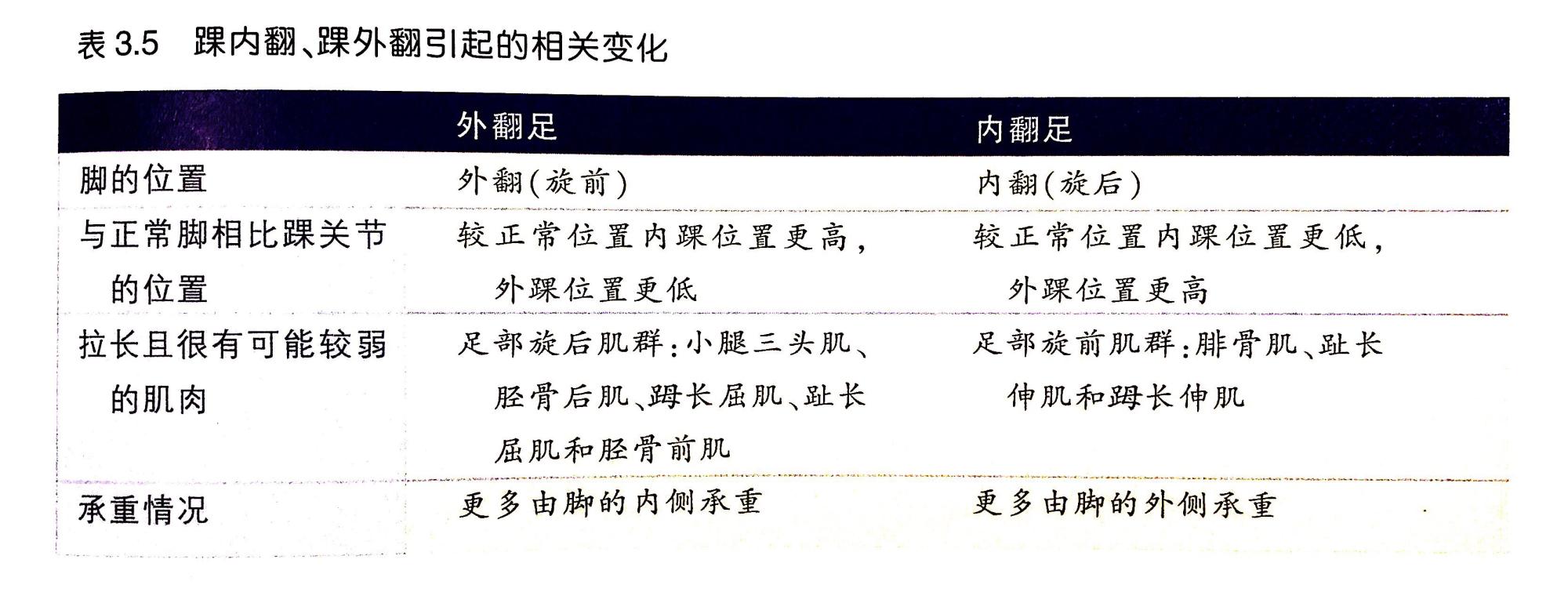 存在足外翻的人,跟骨内翻(旋后)。内踝会比正常脚的内踝位置低,而外踝会比正常脚的外踝位置高,参见上图。这样的位置引起足部旋前肌群无力,如腓骨肌、趾长伸肌和模长伸肌。表3.5总结了这些信息。