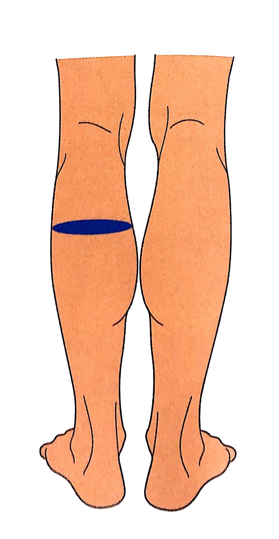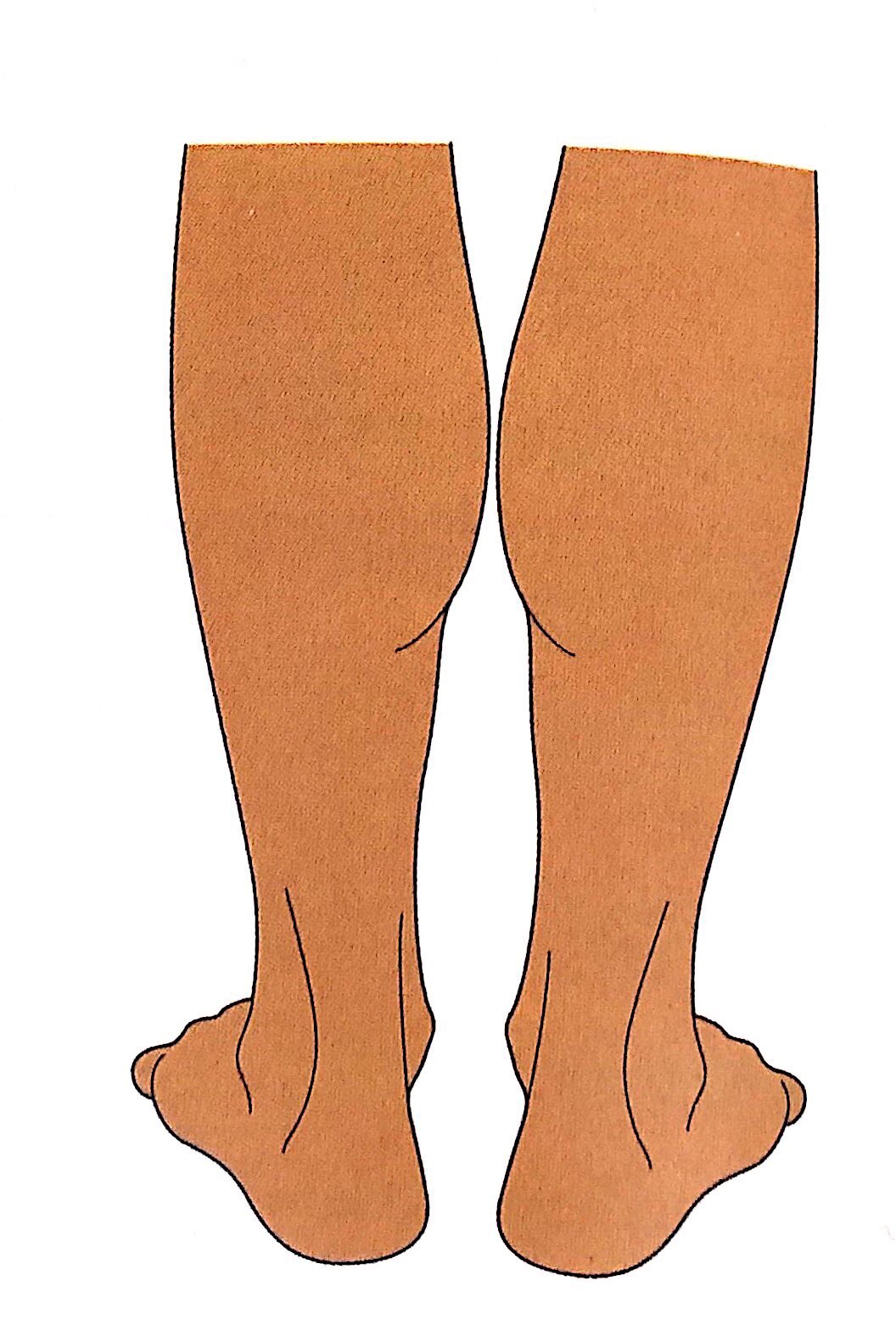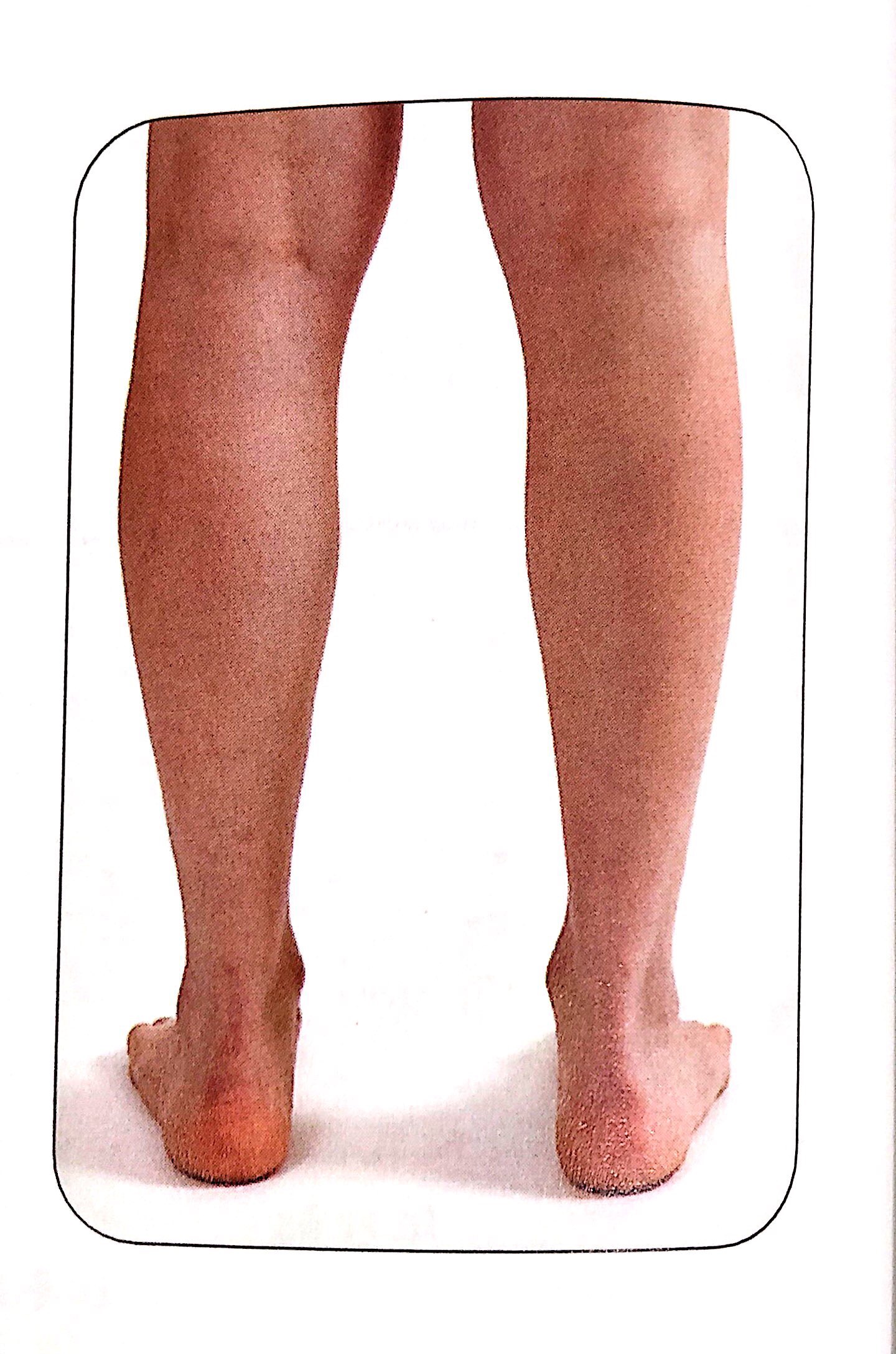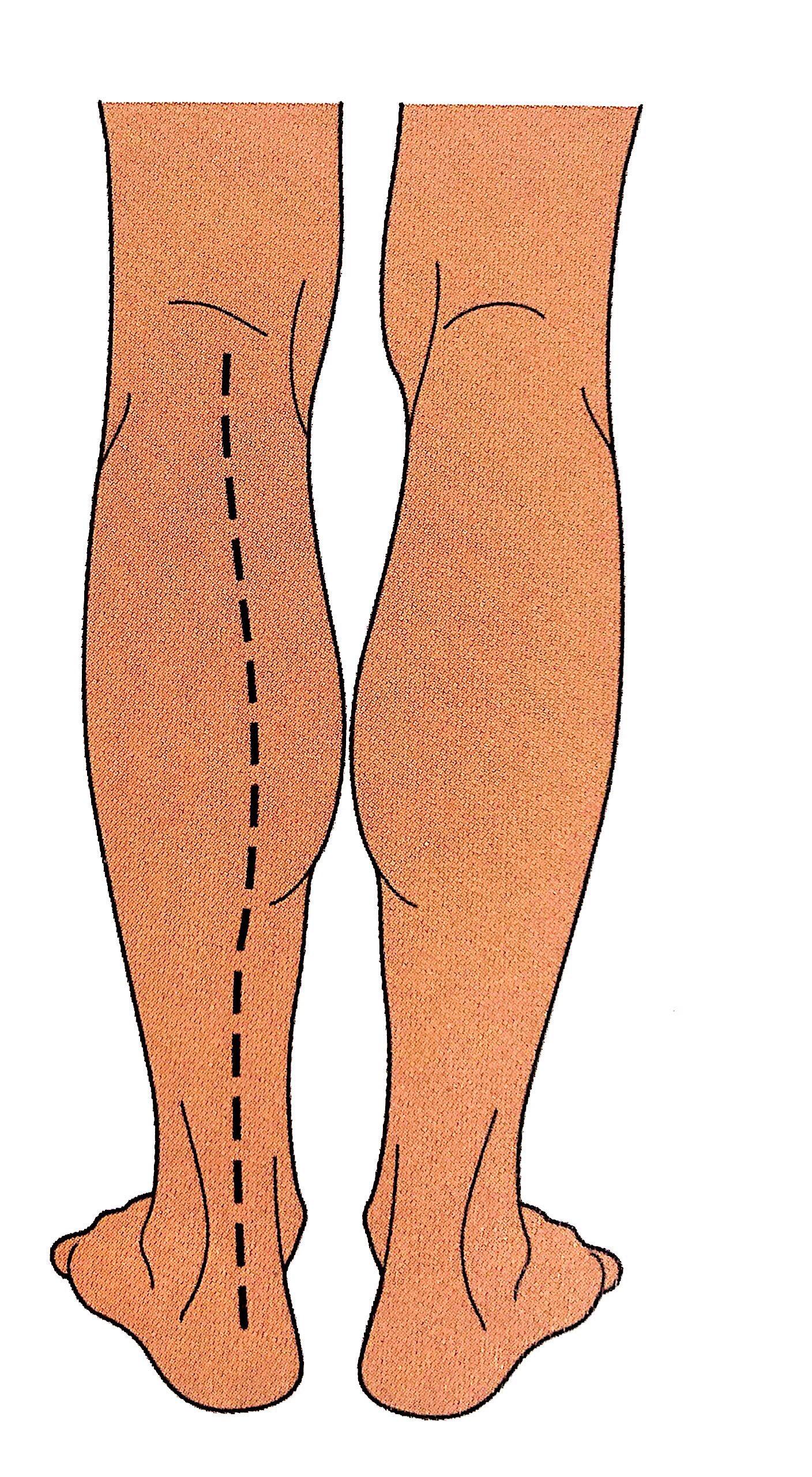 观察:请想象有一条线从腘横纹向下延伸到跟腱,垂直穿过受试者小腿中点。如果有必要,你可以用彩绘笔画出这条线,在比较左右两侧小腿,以及它们与身体中垂线的关系。