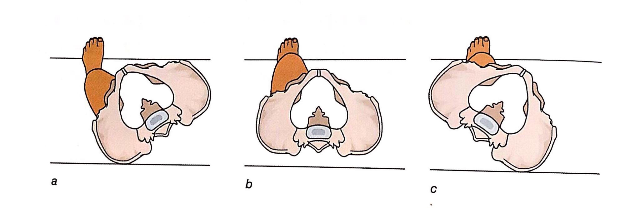 a.骨盆逆时针旋转(向左) b.正常骨盆位置 c.骨盆顺时针旋转(向右)