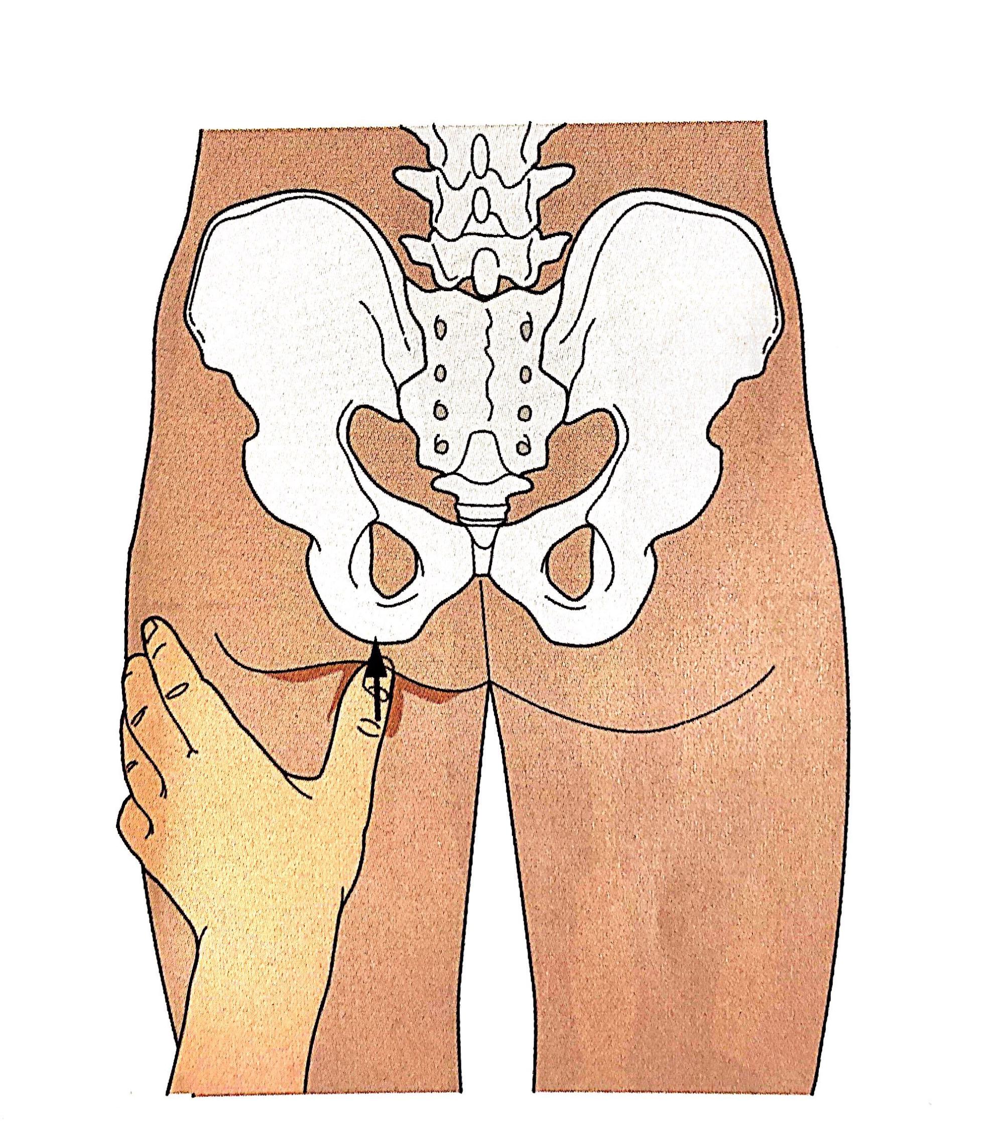 诊断:臀横纹是由覆在臀部肌肉之外的脂肪形成的,它并不能说明臀大肌下束的位置。大部分治疗师,会选择触摸坐骨结节来确认骨盆是否处于水平状态(如下图所示)。但是,如果你对于这个区域的触诊及受试者的隐私而不适宜做这一步的评估。