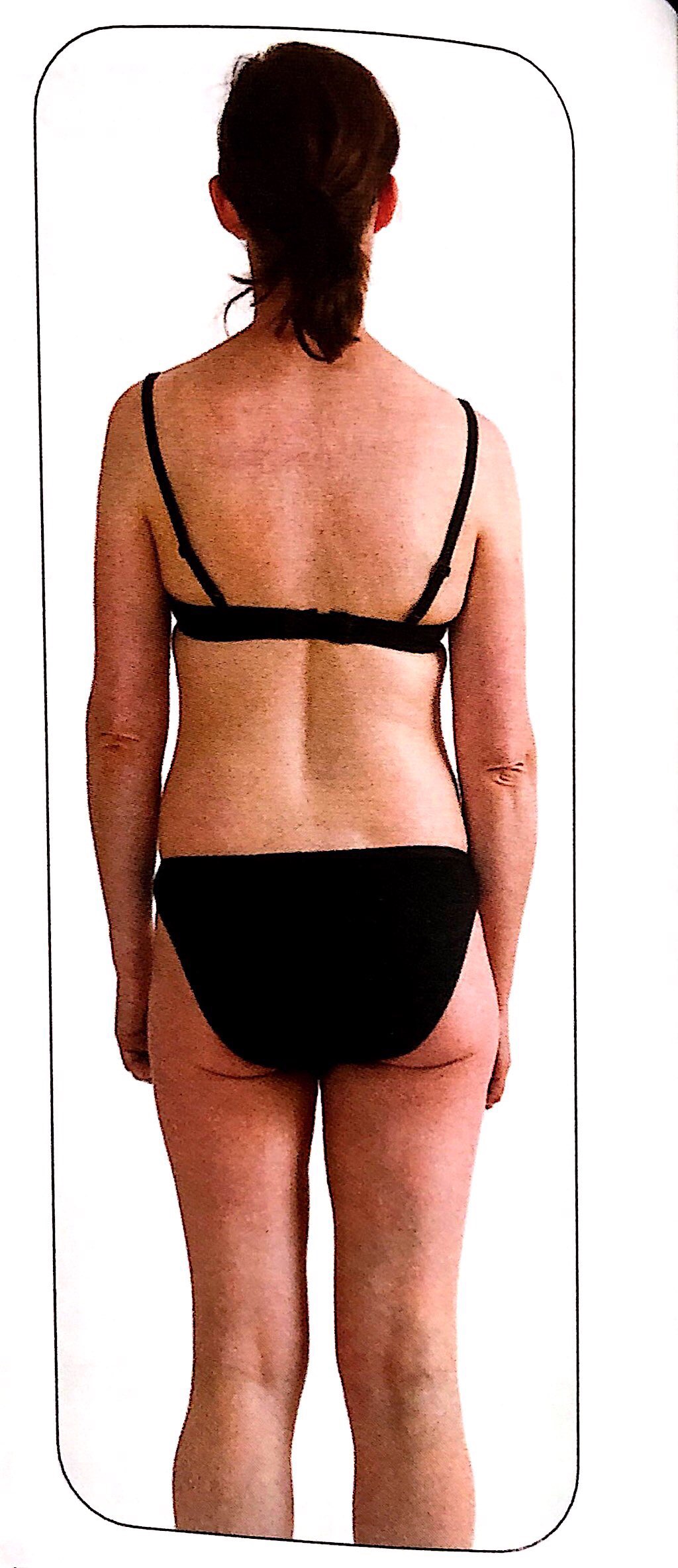 观察:从背面观可以发现照片中同一只脚的内外踝并不等高,内踝明显高于外踝。双脚的内踝应在同一高度,双脚的外踝也应在同一高度。照片中受试者内踝很突出。这是否是因为她的胫骨扭转,导致膝关节连同整个胫骨,包括远端一同旋转?这是否能解释为什么我们能看到双脚内踝比外踝更多的状态呢?
