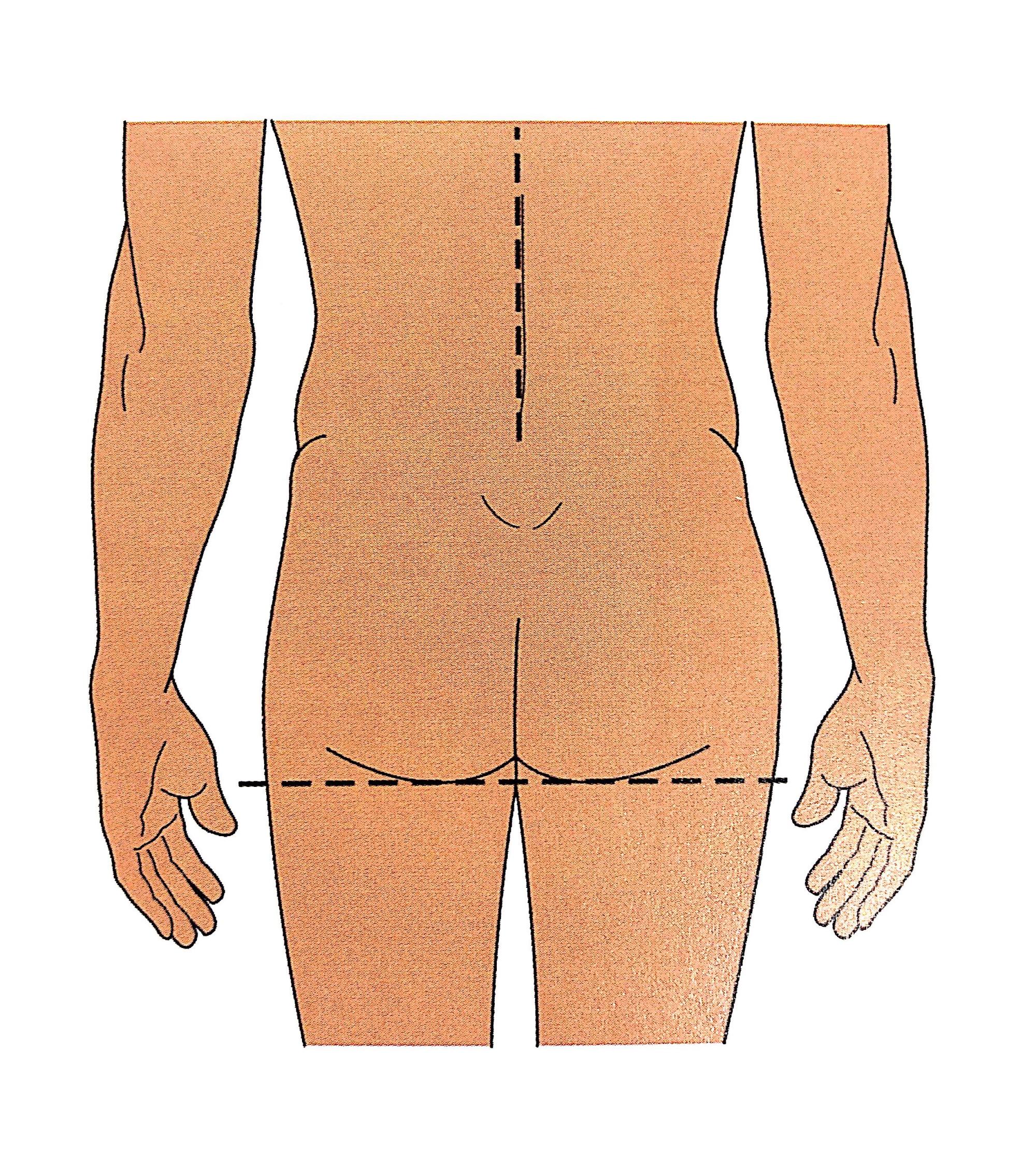 照片中的这位女士很好的展示了臀横纹高度不一的问题,此外在观察她内裤的位置,你是否觉得她的右侧骨盆比左侧骨盆要高些?