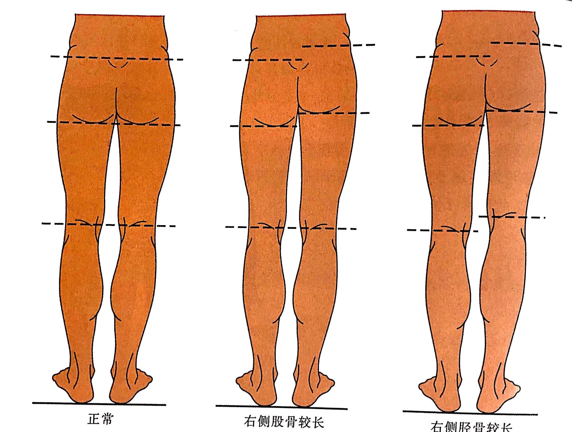 分析:身体承重较多的一侧臀横纹可能会更深。这对于骨盆倾斜的人而言即是如此,就像第二步中讲到的,若受试者右侧的骨盆向上倾斜,那么他左侧的臀位线将相对更深。推的长度不一致是否也会对臀横纹高度产生影响?下图展示了不同长度的下肢对于臀横纹的影响。