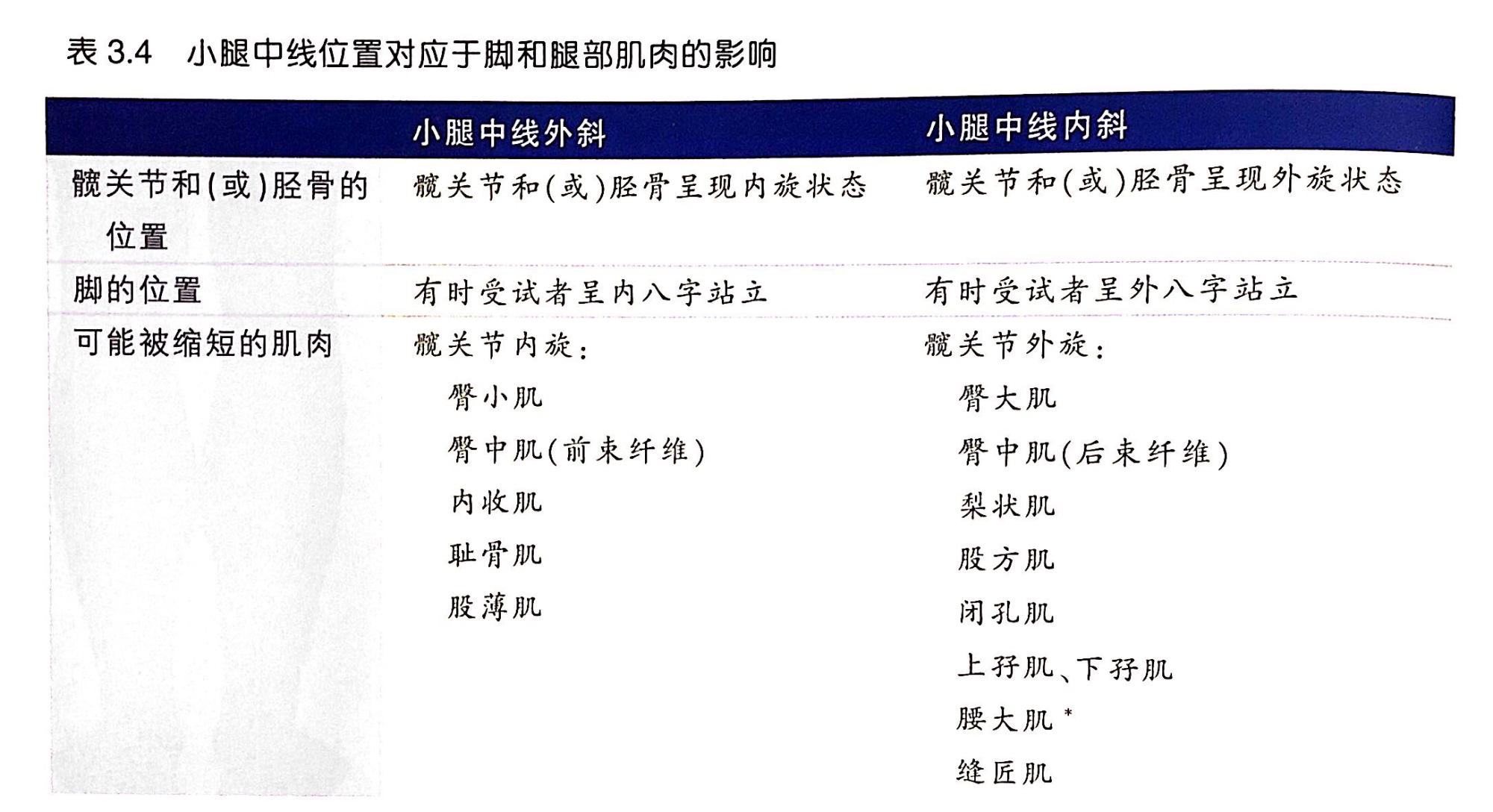 分析:上述诊断的实验表明,不处于中间而是偏外侧的小腿中线可能由于一侧的髋关节内旋,或者该侧胫骨相对于股骨内旋导致的。无论哪个原因,受试者脚都会处于内八字站立的情况。当小腿中线处于偏内侧的位置时,相反的状态就会发生:该侧的髋关节外旋或者胫骨相对于股骨外旋,这种情况下,受试者可能是外八字的形式站立。表3.4总结了以上信息,指出脚在内旋或外旋的情况下,对髋关节集群的影响。