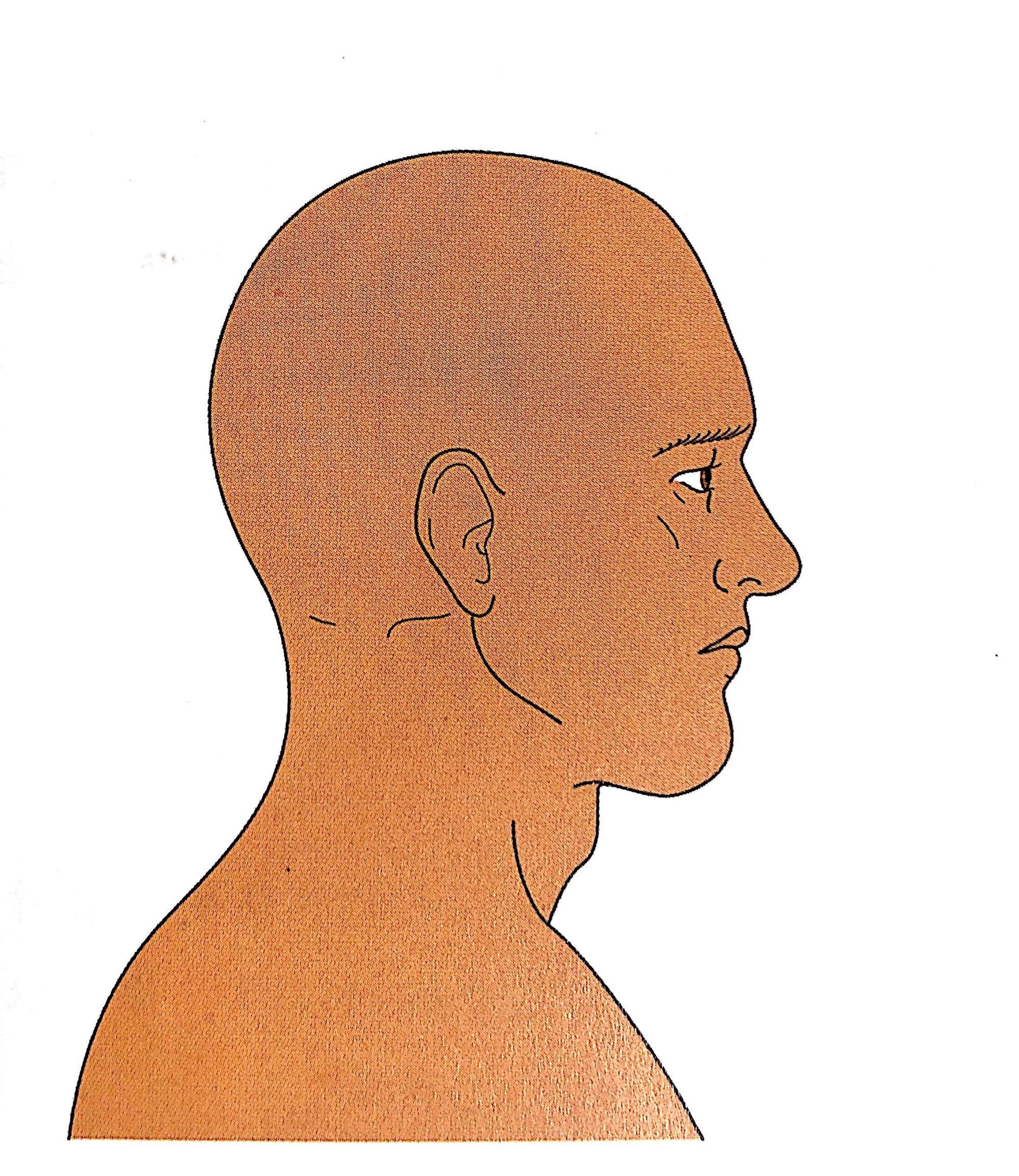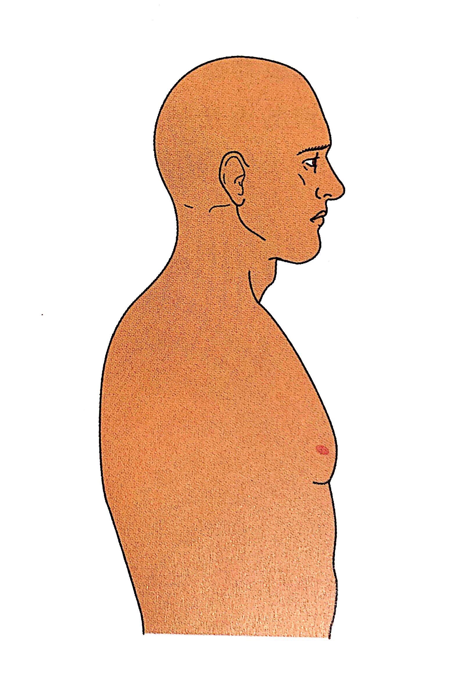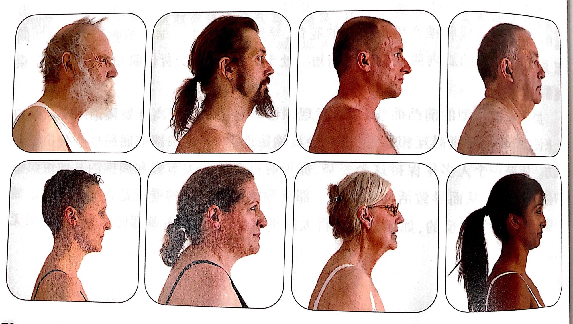 诊断:当你从侧面观察受试者时,为了更简单地定位第七颈椎,你可以让受试者低头,使棘突更明显。下面有八张图,诊断出哪些人存在头部前伸问题,哪些人存在颈椎前凸幅度增加的问题,哪些人的颈部比一般人的较长?还可以进一步观察比较它们各自颈胸交界处的状态。