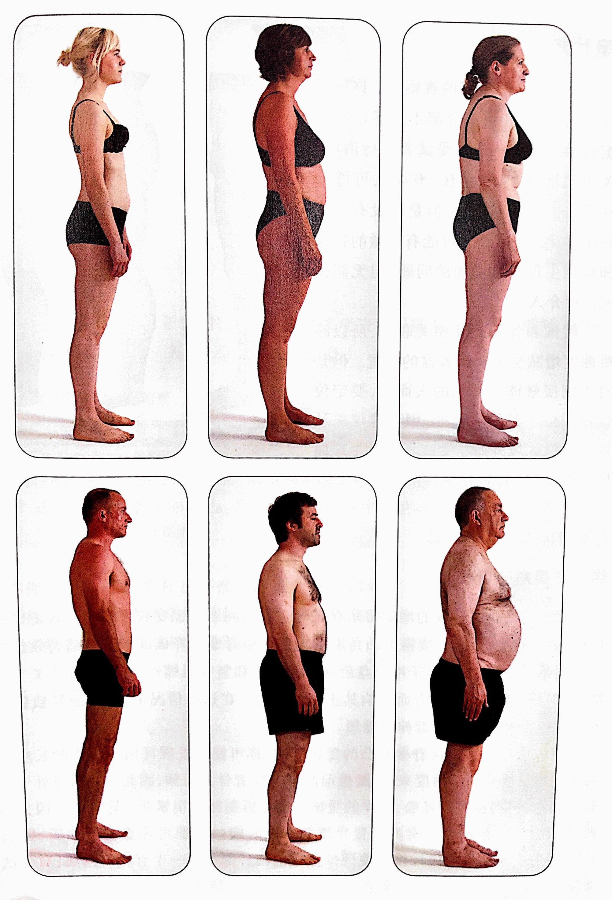 诊断:对于正常健康的人而言,腹部应该是平坦的。观察下面的照片,从侧面角度观察腹部会呈现的不同形状和位置。
