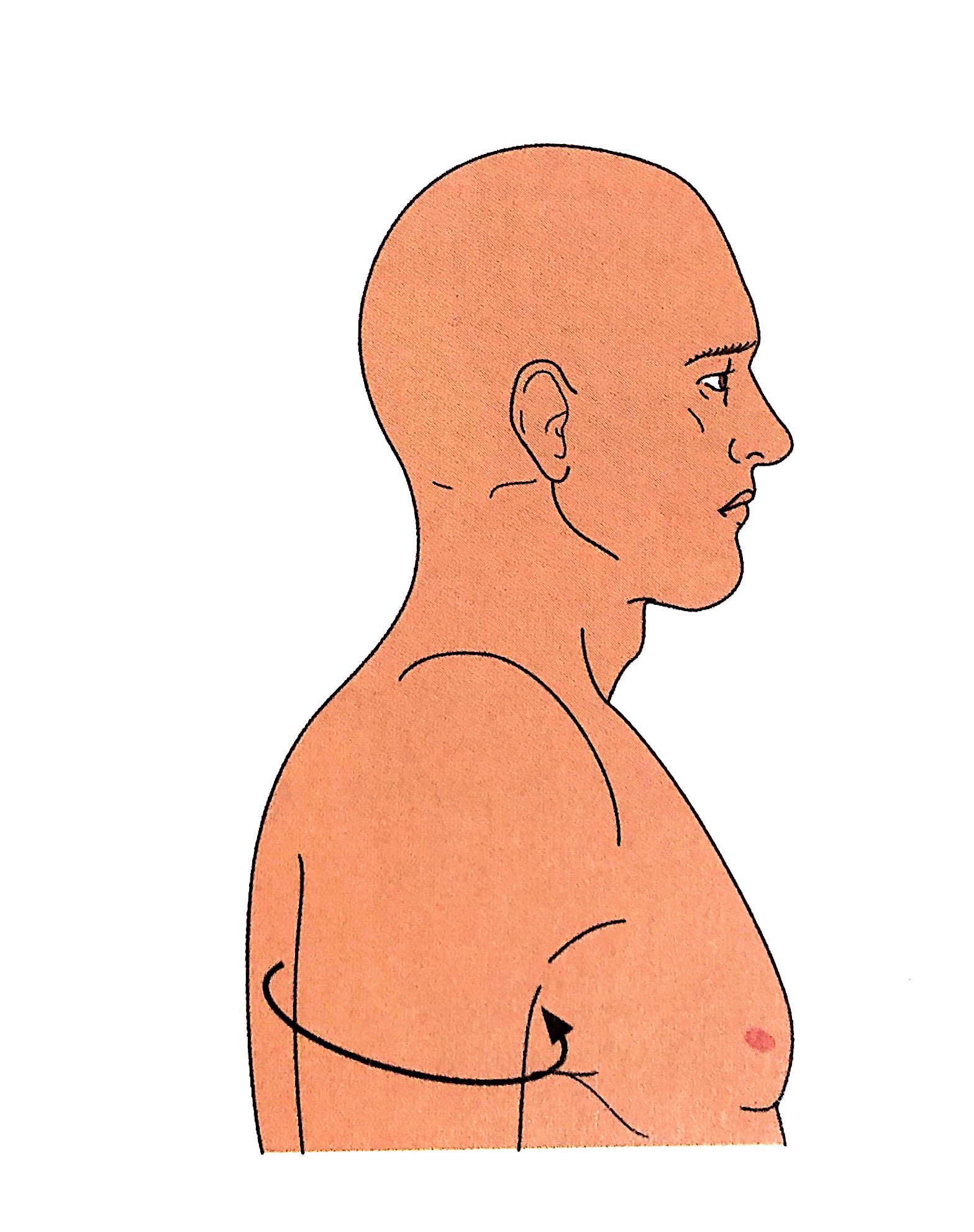 观察:受试者的肩部,判断它与头和颈部的位置关系,是否与耳朵处于同一条线上,或者存在肩部前伸现象(即手臂内旋);或者让受试者像站军姿站立一样,挺胸抬头,观察肩部是否后缩。