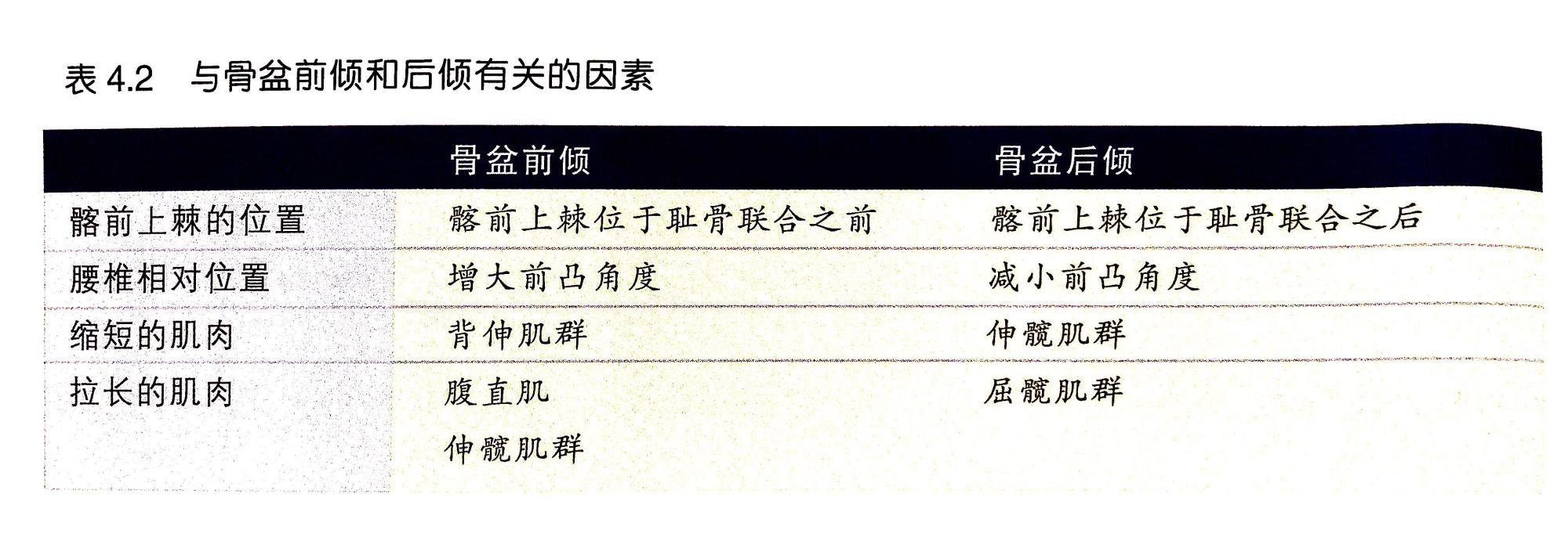 分析:骨盆前倾时,腰椎前凸角度会变大,因此受试者可能在该区域会产生腰椎前凸现象。这种状态下可能会增加要不椎间盘后侧和腰椎小关节的压力。这个状态与腘绳肌和腹直肌伸长无力有关,也可能与腰大肌和股直肌缩短有关。骨盆后倾时,腰椎前凸角度会变小。这种状态与伸髋肌群被缩短紧张,以及屈髋肌群伸长无力有关。表4.2总结了这些信息。
