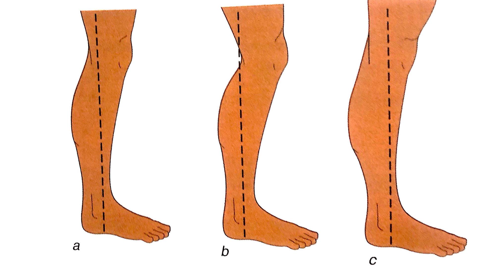 观察:侧面体态评估是观察受试者膝关节的好机会。正常中立位(a)、屈曲的(b)、过伸(c)