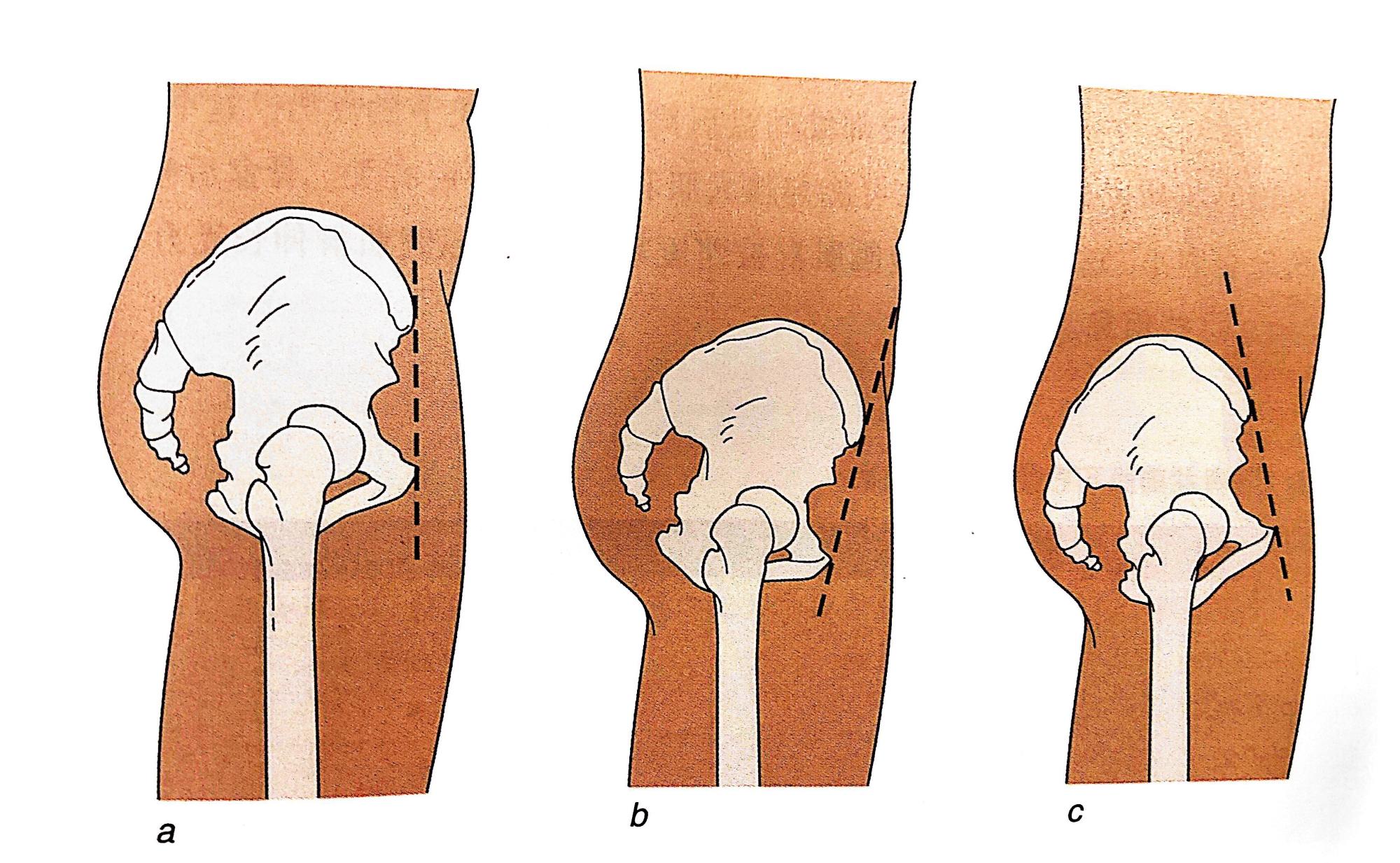 观察:骨盆的运动对应于腰椎形状的变化,它可以处于正常的位置(a)、前倾或者后倾。骨盆前倾的描述是当髂前上棘(ASIS)位于趾骨联合之前是骨盆的位置。骨盆后倾的描述是当ASIS位于趾骨联合后方时盆骨的位置。