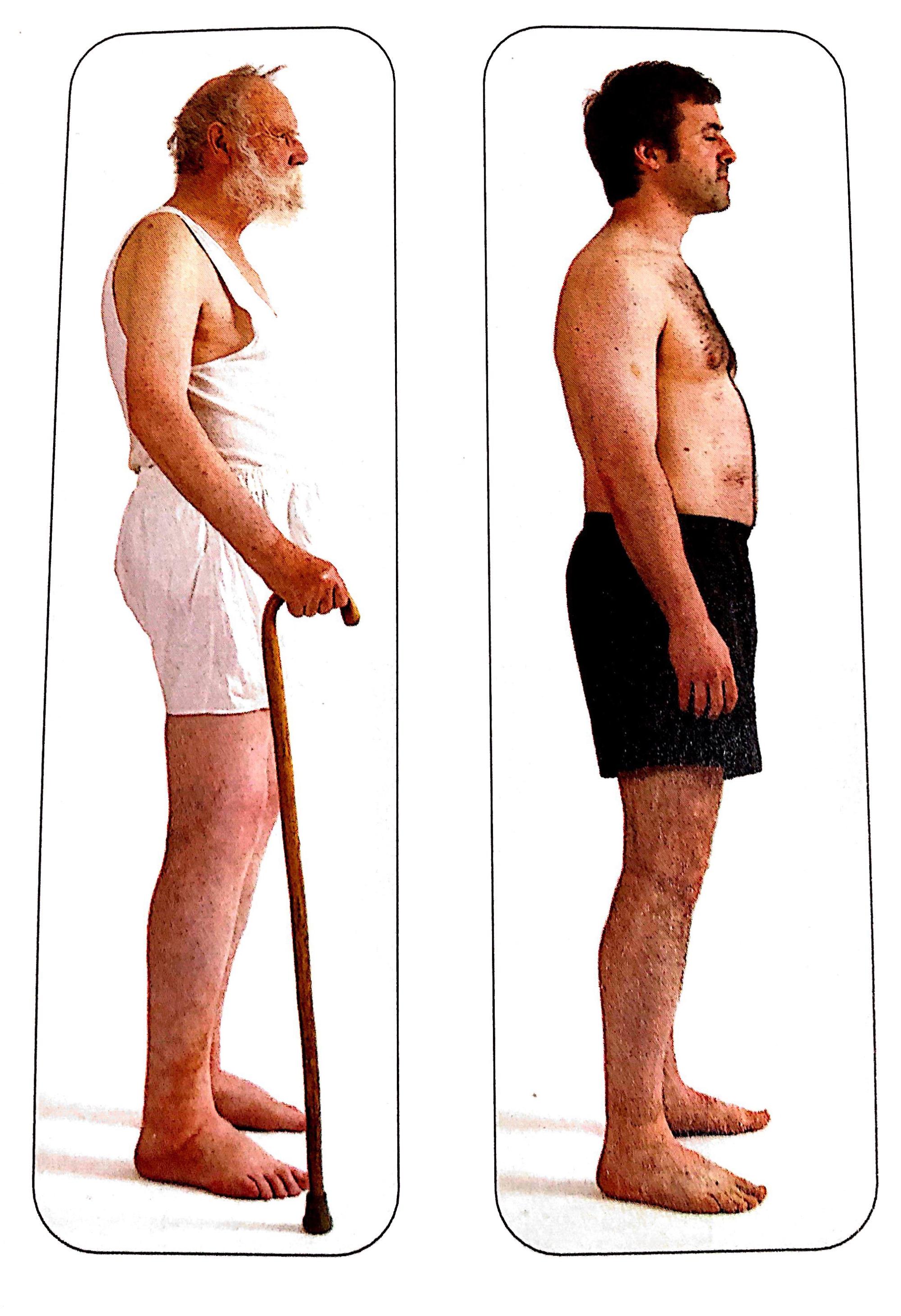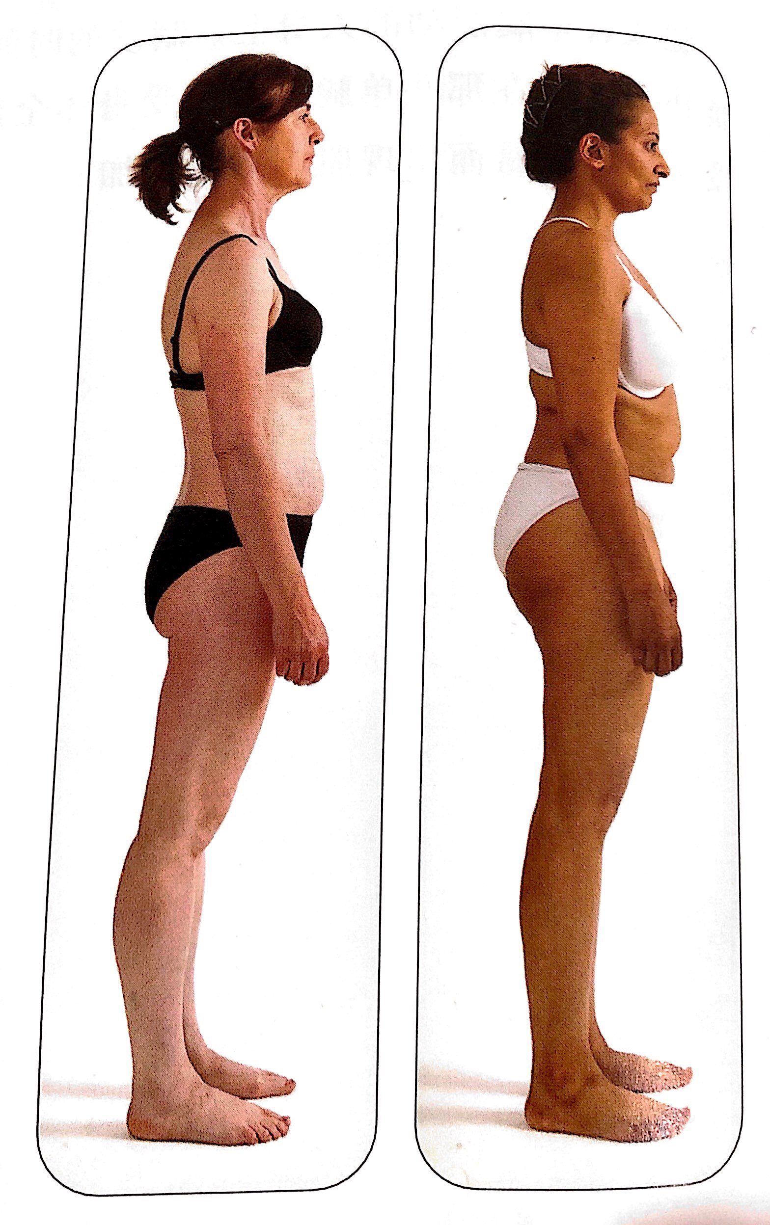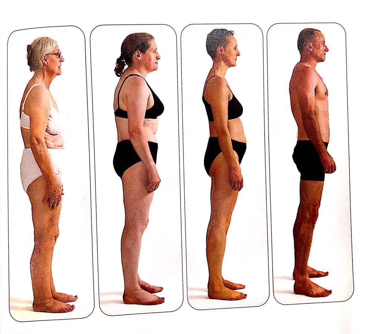 再看看这四张照片。如果从他们的踝关节往上画出他们的中垂线,找到上图相应的骨架。可能会找出一个上半身属于某一骨架图片,而他的下半身有属于另一个骨架图片,事实上我们需要一个包含更大范围体态类型来进行比较对照。