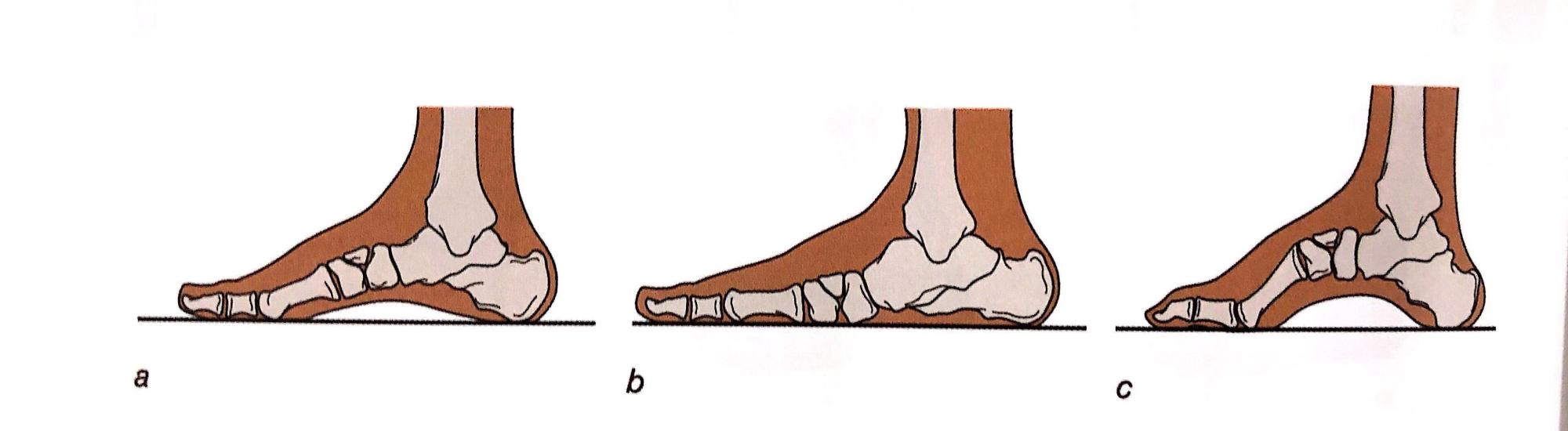 观察:脚的足弓,正常的足弓(a)扁平足(b)高弓足(c)。