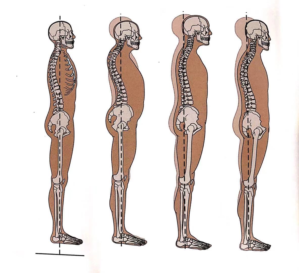 在完成侧面评估之前,向后站些,整体地去观察受试者。下面的第一张图说明的是一个“经典的”标准体态,第二张图说明的是存在胸椎后凸并伴随颈椎腰椎前凸的状态,第三张展现的是过分平直的脊椎状态。第四张说明的是背部后凹。