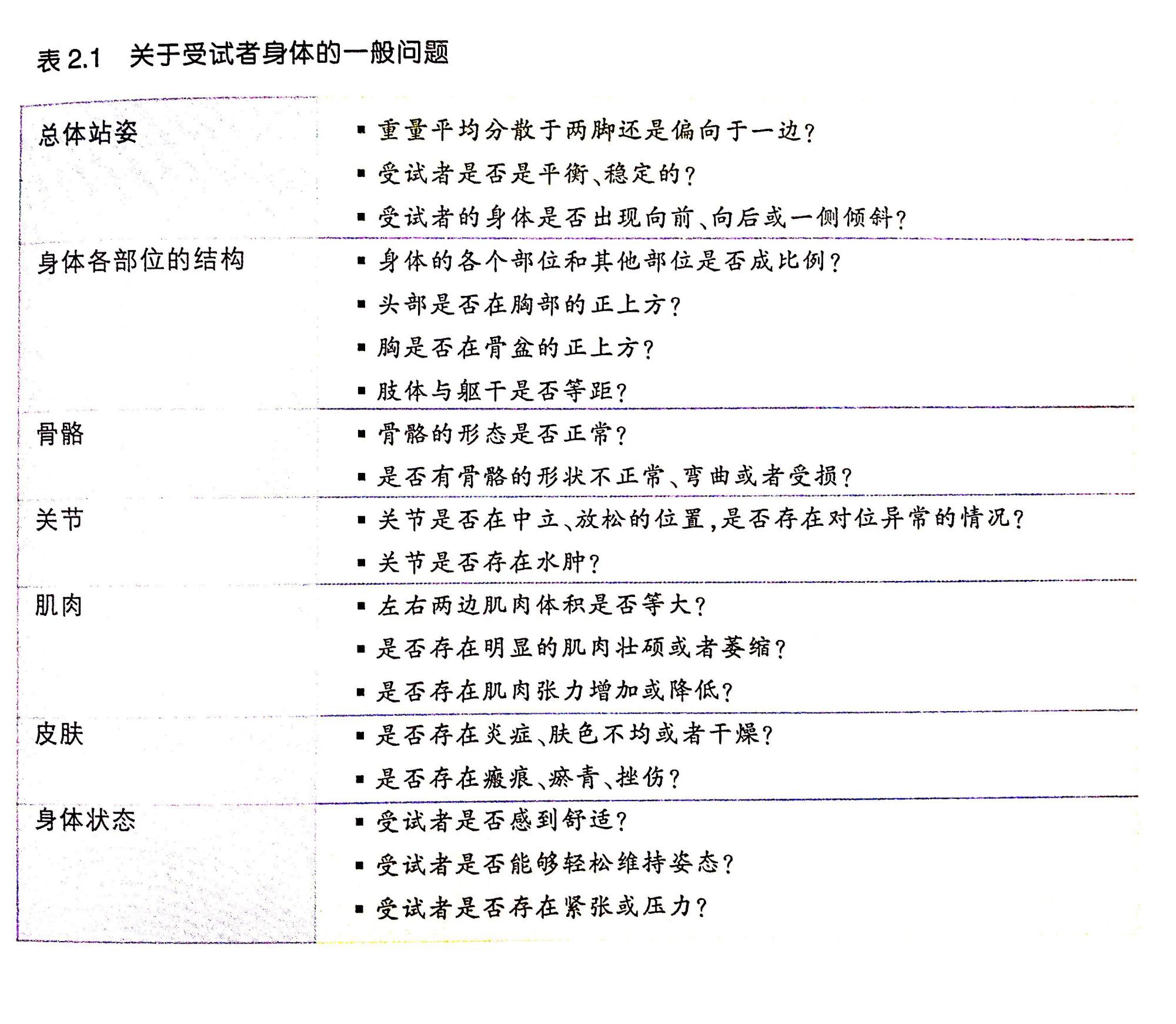 其次,在开始前,要带着问题进行体态评估,表2.1给了一些相关建议,可供参考。在测试过程中进行的好坏很大程度上会决定受试者与测试者之间的信任,因此测试者要时刻注意在观察过程中尽量减少个人的评价。
